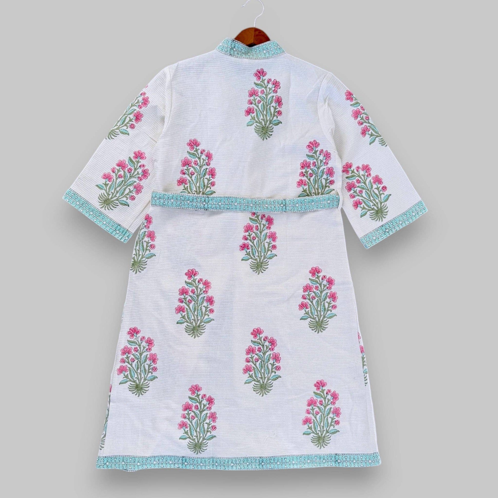This robe showcases a beautiful block print design made in 100% Cotton, perfect for blending comfort and elegance. It features a printed border along the neckline, front opening, bottom hem, and sleeve openings, adding a touch of sophistication. The thoughtful design includes functional details that make it both practical and stylish.