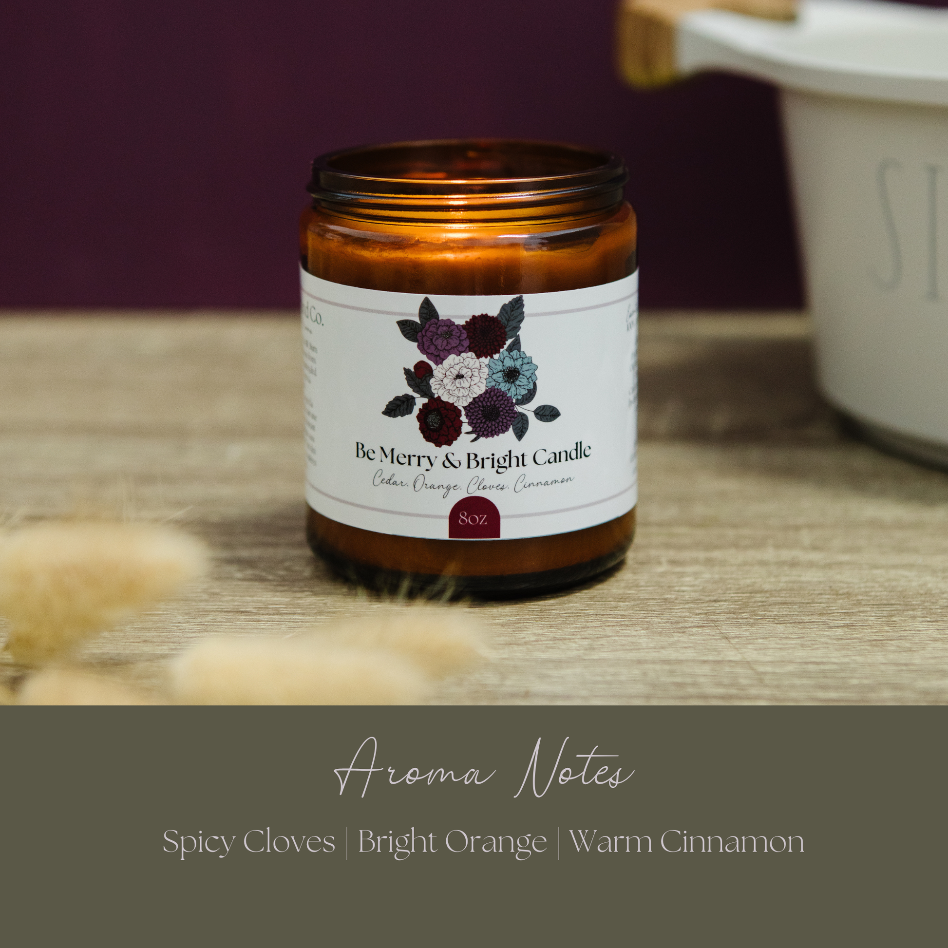 Crafted in an 8 oz amber glass jar with a metal lid. Made with a soy-beeswax blend, cotton wick, and our in-house essential oil blend. No synthetic fragrance. Burns 45–50 hours. Hand-poured in small batches in Canada. A customer-favorite for holiday displays, cozy rituals, and clean-burning seasonal gifts.