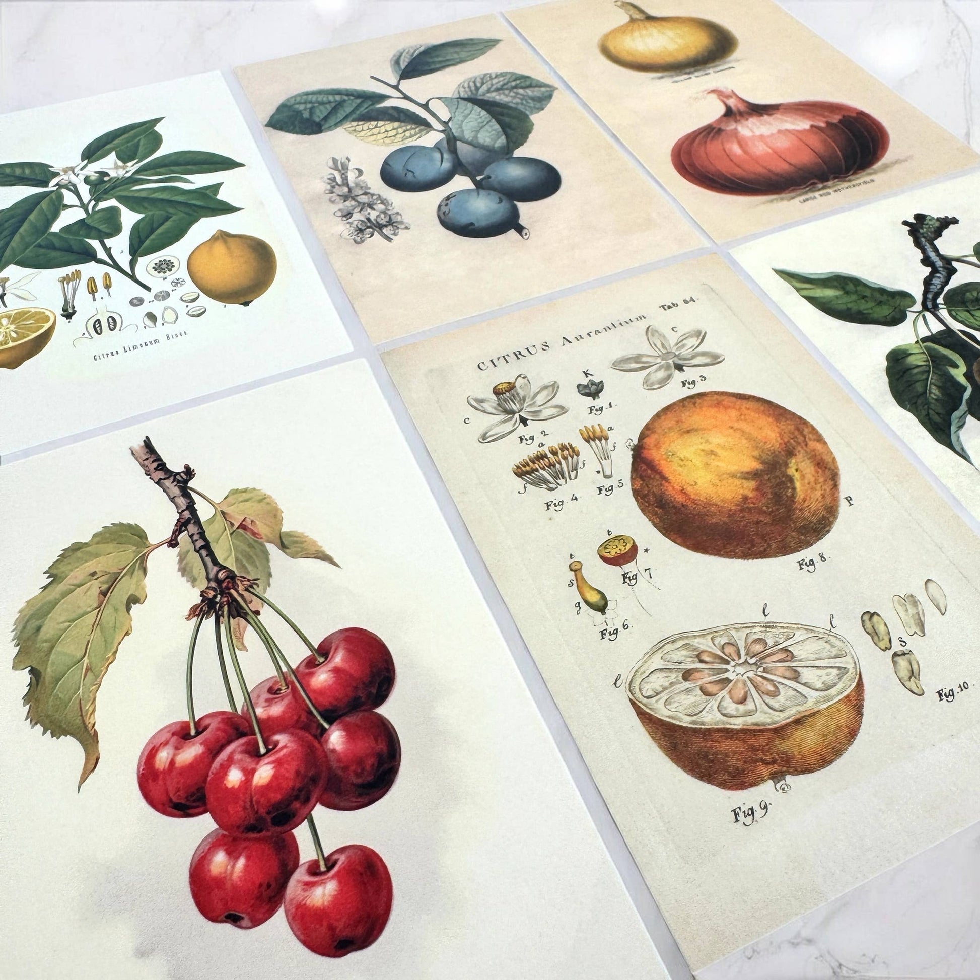 Twelve blank spaces waiting to be filled with family favorites and kitchen experiments worth keeping. Each one graced with a vintage botanical illustration — onions, plums, cherries, lemons and oranges — like pages from a long-forgotten garden journal. Six different designs in all, printed on 4 x 6 heavyweight cotton cardstock meant to last through decades of dinners and descendants.