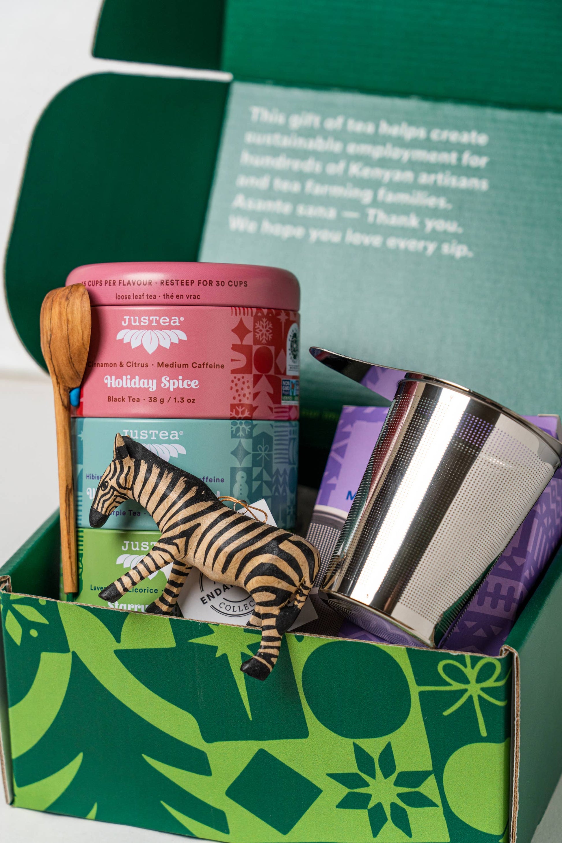 PERFECT GIFT: Each box includes our Holiday Tea Trio, a Hand-carved/painted Zebra Ornament from Kenya, a Hand-carved Kenyan Tea Spoon, and a Tea Steeping Infuser.