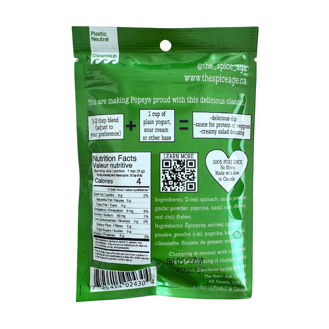 Ingredients: Dried Spinach, onion powder, garlic powder, paprika, basil, chives, red chili flakes, salt.